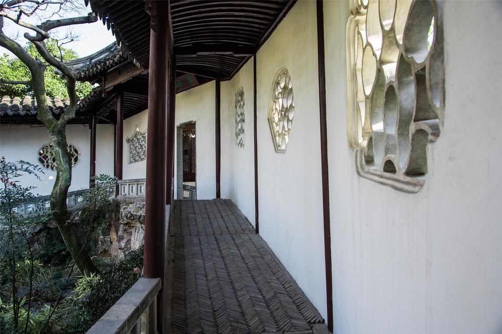 一进留园大门,走过长达五十米的曲折而狭窄走道,长廊墙壁上各式各样的漏窗,透过漏窗看到若隐若现的湖光山色。怪石假山、曲折长廊环环相扣的空间景色,庭院中不断变换的建筑组合,形成了一个有节奏有韵律的整体。