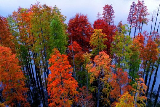目前,这批水杉已全部成活成林,最大的胸围直径约60厘米,成为八面山的独特风景。冬季时节,高大的水杉树一改夏日的葱郁,穿上火红的冬装,成了八面山一道靓丽的风景。