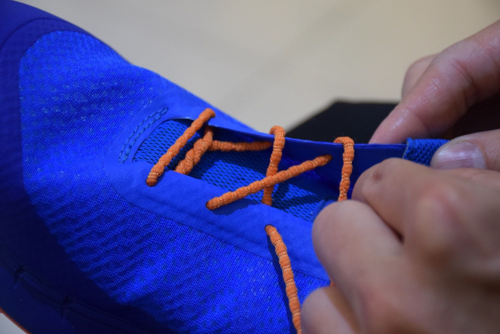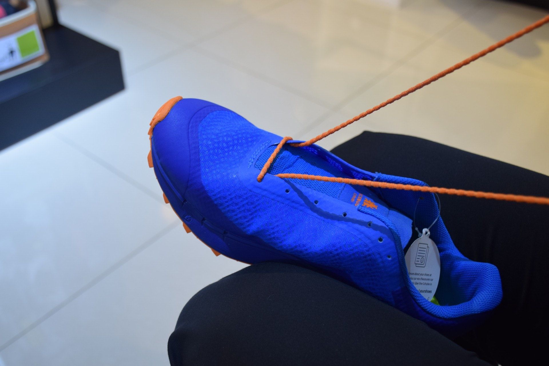 之后这一步与普遍绑鞋带的方式大不同,将两边的鞋带互相缠两个圈,之后锁紧。这一条一定要好紧,防止脚部滑前;脚部这个位置可以受力,不怕夹紧。