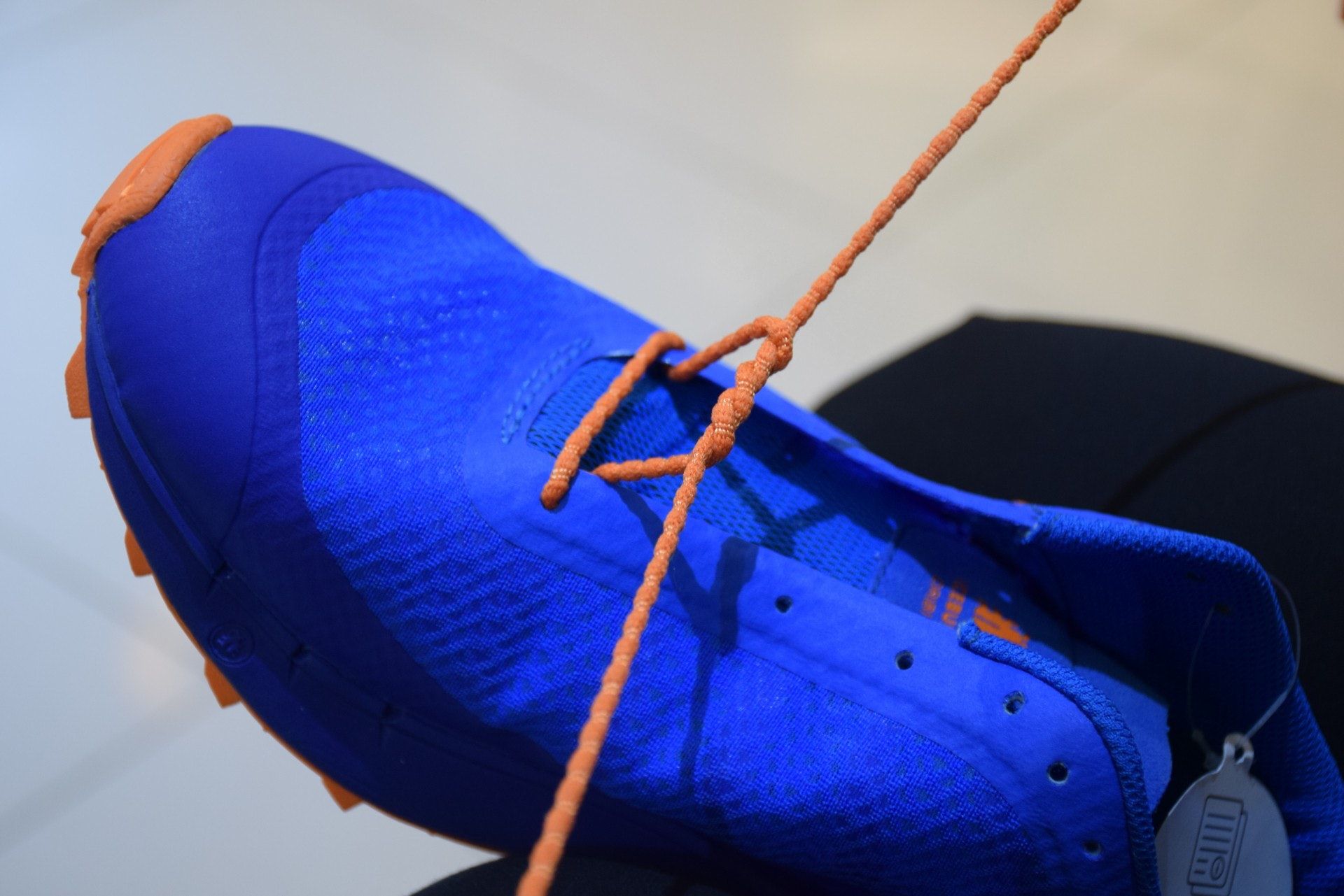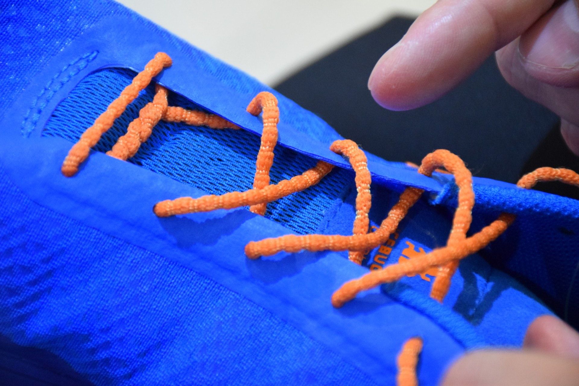 这个绑鞋带方法主要适用于低帮的户外鞋,先将示范这款徒步登山鞋的鞋带不断松开除下,直至鞋带只穿过最近鞋头一排的两个小孔。