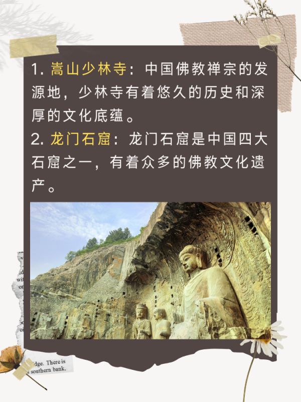 2. 龙门石窟:龙门石窟是中国四大石窟之一,有着众多的佛教文化遗产。游客可以在这里欣赏到精美的石刻艺术,同时还可以了解到佛教文化的历史背景。