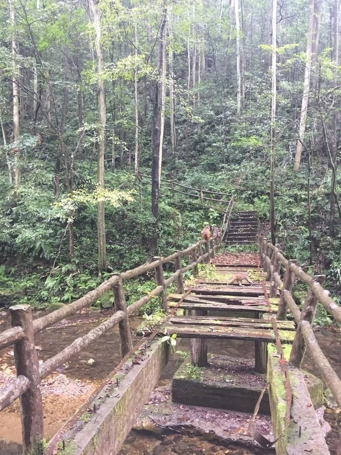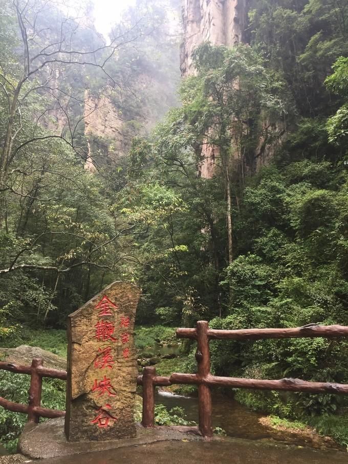 金鞭溪沿途风光很好,溪水就在旁边,非常享受,会路过 长寿 泉,紫草潭等景点,当走到千里相会景点时,往左边的岔口走上山的的话是乱窜坡,爬完乱窜坡可以到达山顶的袁家界景区,但爬坡比较费体力费时间,需要一个半小时到两个小时。如果在千里相会景点继续沿着金鞭溪走平路的话会走到水绕四门,水绕四门会有环保车给送到百龙天梯,乘坐百龙天梯会到达山顶,这种方式省体力也能欣赏沿途的景色。当时选择了爬乱窜坡的方案,结果爬到一半就后悔了,还是建议去乘坐百龙天梯上山。