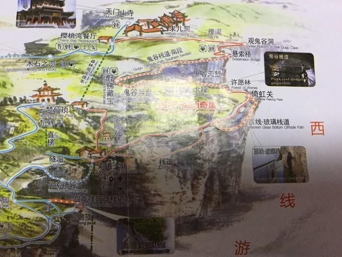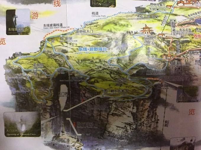 西线游完后游览东线,东线游完后到达 天门 翻水后,乘坐穿山自动扶梯到达 天门 洞。先游西线再游东线的好处是可以减少爬山所费的体力,从中线到西线再到东线基本都是下坡路。