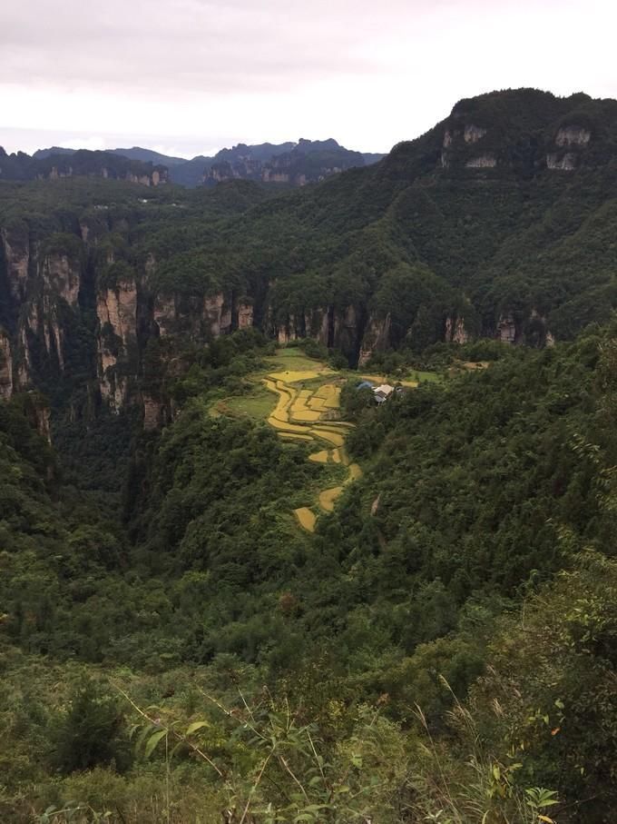 游玩天波府返回杨家界景区环保车站,休息吃点东西后乘坐环保车来到丁香榕三岔口车站,在这有卖到老屋场游线的电瓶车车票,该车票需要另行收费,50元一个人来回,该线路还是值得一游的,旅游团一般都不去。车送到终点后,下坡步行一段路程可以看到空中田园,远观百龙天梯的壮观景象。