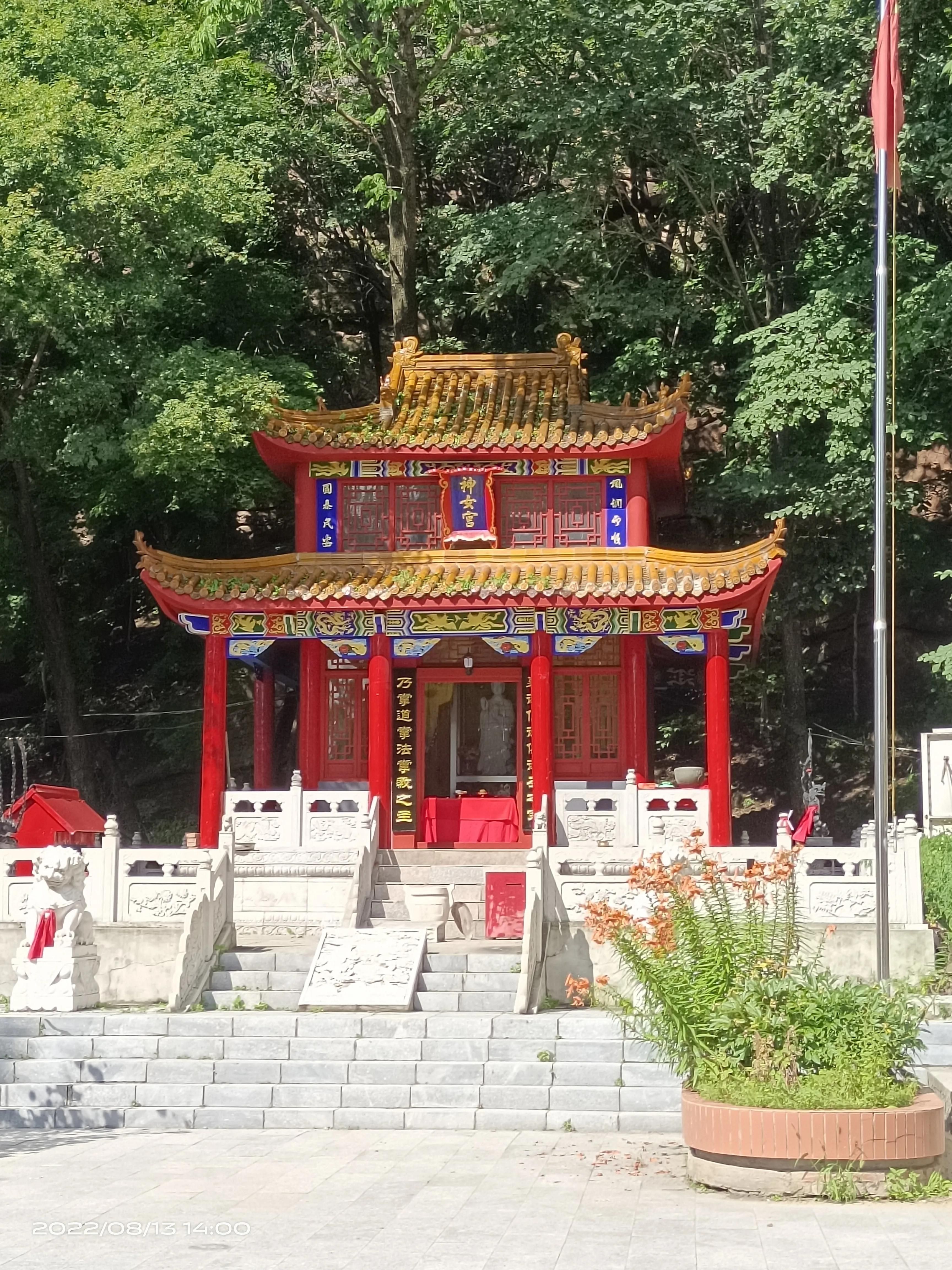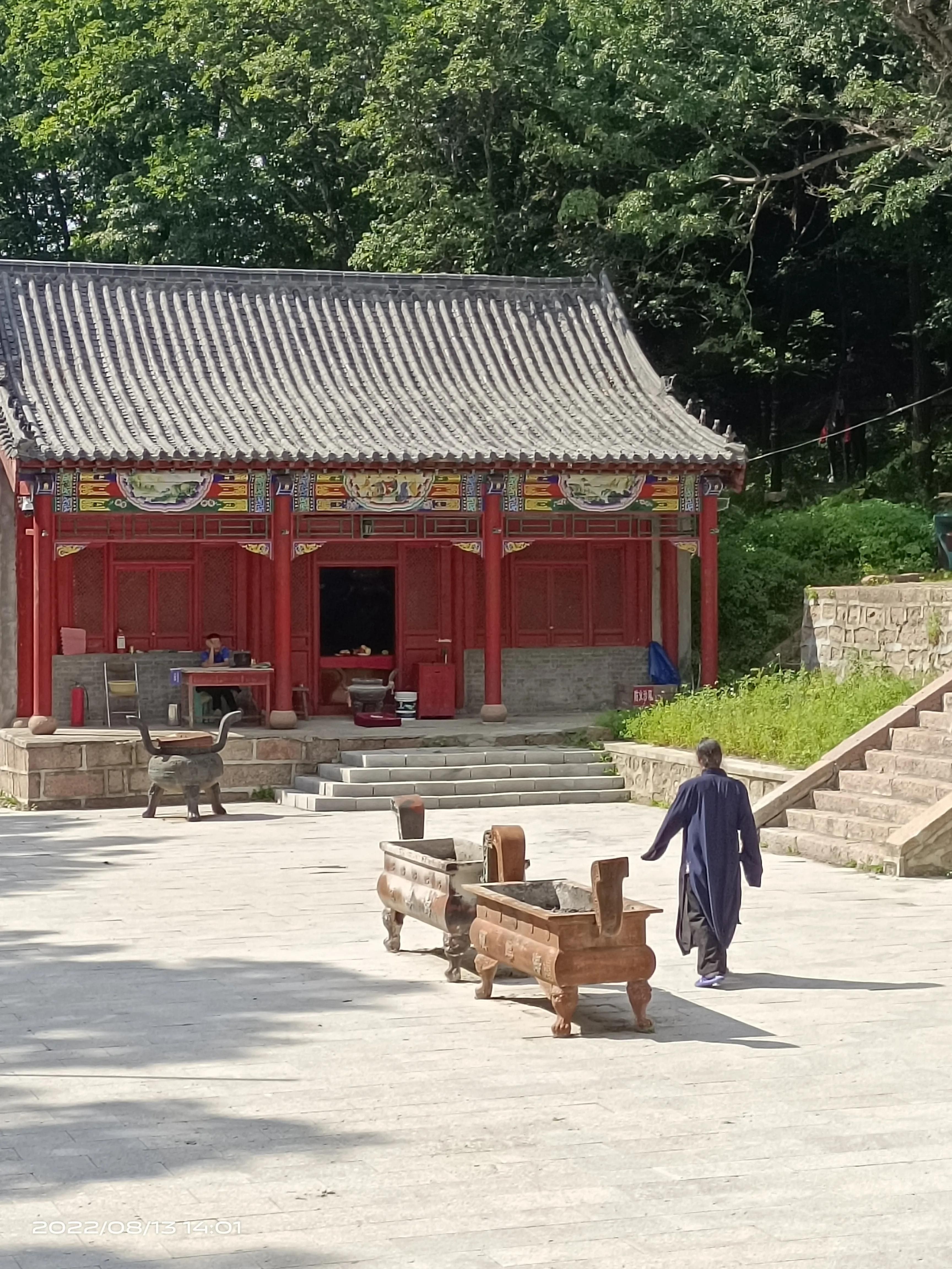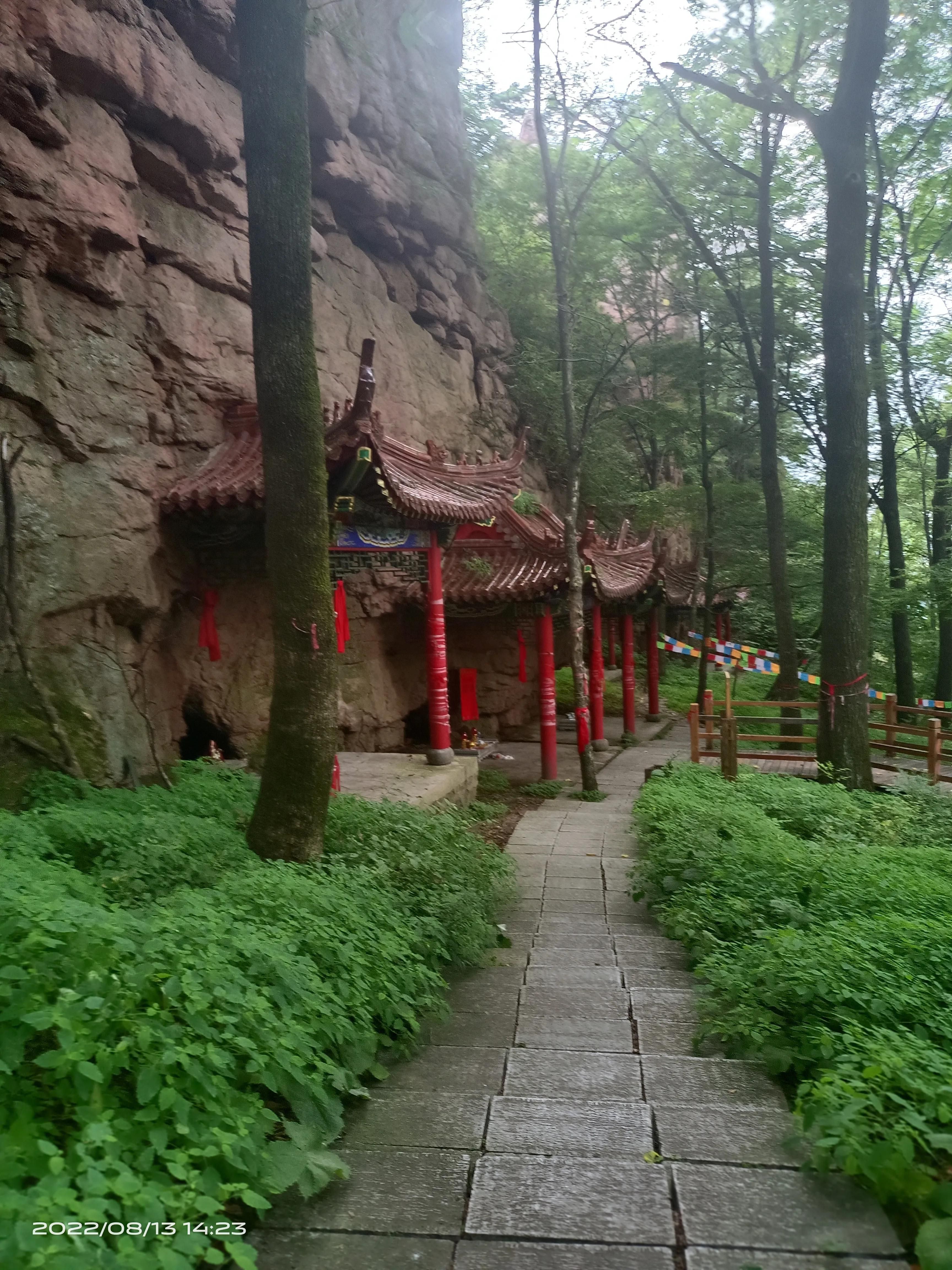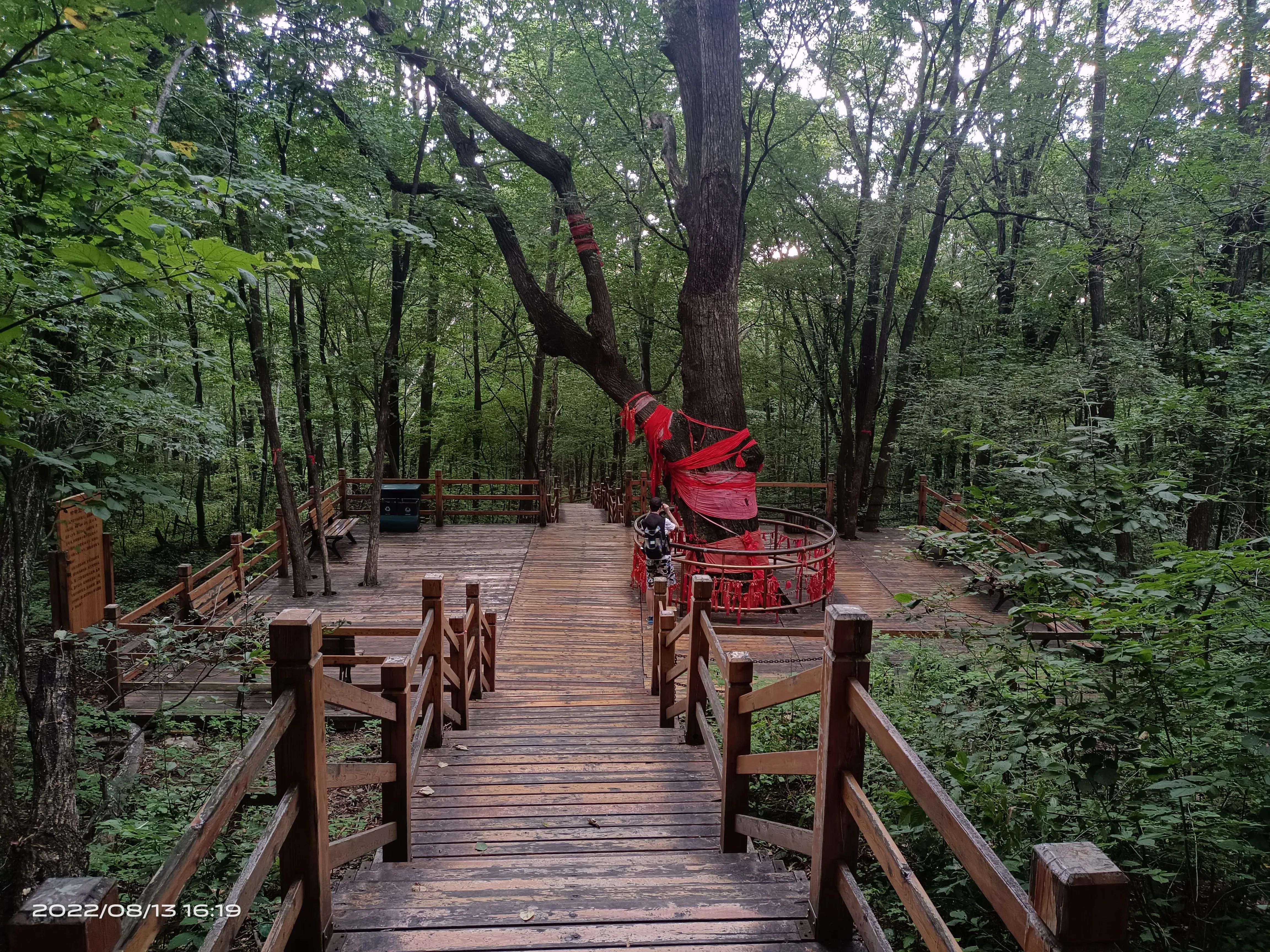 私家车可以开到山门的停车场。购票后一条平坦的大道去往山脚下。(可以选择坐景区巴士票价10元单程)我们一家选择徒步,喜欢这样山林掩映的景色。一叶知秋,刚过立秋,树叶已经开始零星下落,飘荡荡的也落了一地。山风一吹翻滚着迎接我们。蝴蝶脚前脚后的飞舞。城市待久了这也算新鲜。道旁还有养蜂人,出售蜂蜜。步行10分钟到了山脚下,立刻就感觉到了道教文化,古色古香高大的牌楼链接着低矮些的中式耳室,广场中心地面铺装成八卦的图案。中心是一个铜炉。入口处是一个蝴蝶标本的展览处。进入景区,左右耳室前各有一面鼓。鼓声浑厚。入山正道上一块石刻红色的道字。宽大的石阶一看就容易爬。顺石阶而上,一些景观掩映在这片古山林里。这里的树都是北方古老的树种,水曲柳,老榆树,柞树,黄菠萝,核桃楸……除此以外这些树种也只在林场有了。边走边看就可以了。到了商亭的位置就要有点规划了。如果是走全部景点。那就要先到海云观,很整洁干净的道观,临崖边,可跳看到山脚的村落。有一处秘境梯,上去是棋盘峰。登到顶端,视野开阔远山近林色彩搭接如画。勇敢的大妈和小伙都跨过铁锁,或坐或站崖边拍照。我和鑫诺都坚守底线不违反景区规定攀越。也没对到此一游留念拍照那么有激情。看完棋盘峰,沿原路返回。梯凳上留着些谷物,这可能是园区工作人员给鸟留的食物。穿越太虚洞,就到了五仙洞。沿着栈道直行,到了千层岩和重阳峰的分界处,走千层岩这里。最后到北乳峰,可以登高的。当我和鑫诺到峰顶,已经很少有游人来了,回到峰底,继续前行,最后到了狐仙爷爷洞。这时又要按原路返回。这回选重阳峰的路线。沿途路过六十辰像,回到了商亭,下山在去石室,一线天,柞树王(有500多年的岁数)回原路上下山。还有一种省时游法,到了五仙洞后,往回到六十辰像,然后下山依旧。只是不去双乳峰,狐仙爷爷洞和重阳峰。(双乳峰里的南乳峰没开发,重阳峰没开发 ,狐仙爷爷洞也类似五仙洞)而这段距离远景点少,多数没有开发完。回头路很多。这样最少节约一两个小时。也不影响爬山的完整性。