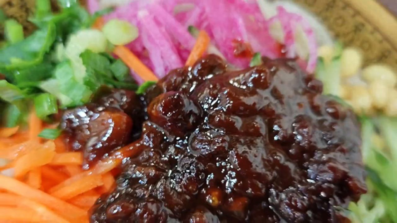 给老妈扎个美美的头发,下午准备去什刹海,睡了一觉感觉又活过来了。我们的住宿就在这个胡同,个人感觉住在这里不是很方便,离最近的地铁站也要五六百米远。今天又是阳光明媚的一天,吃碗北京特色的炸酱面,看着还行,但味道一般。陕西人吃完面必须再来碗面汤。