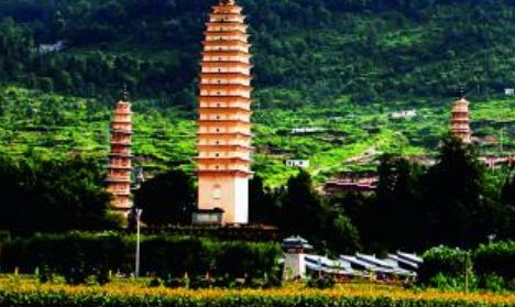 大理三塔位于大理古城西北角,苍山应乐峰下,建于南诏丰祐年间(公元823~859年)。原规模宏大的崇圣寺依苍山建立,三塔在寺门前,后被毁。三塔巍然屹立。主塔名千寻塔,高69.13米,为16级密檐式方形空心砖塔,是典型的唐塔建筑风格。塔身四面逐级交错,建有相对的券洞二孔,佛龛二孔,内置石雕佛像和菩萨像。塔顶有塔刹和大鹏金翅鸟。前有石砌照壁,照壁上嵌有“永镇山川”四个大字。南北小塔矗立在大塔西南、西北角,塔高42.19米,为八角形10级楼阁式空心砖塔,为典型的唐塔建筑风格。