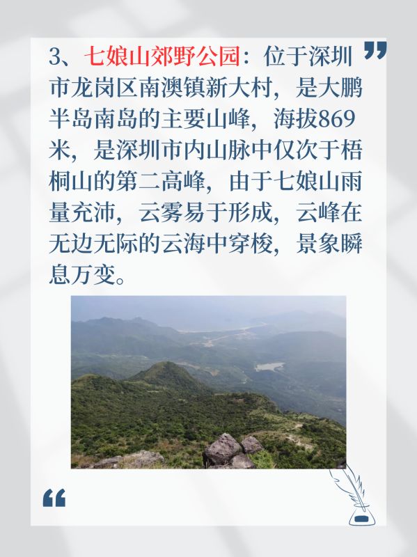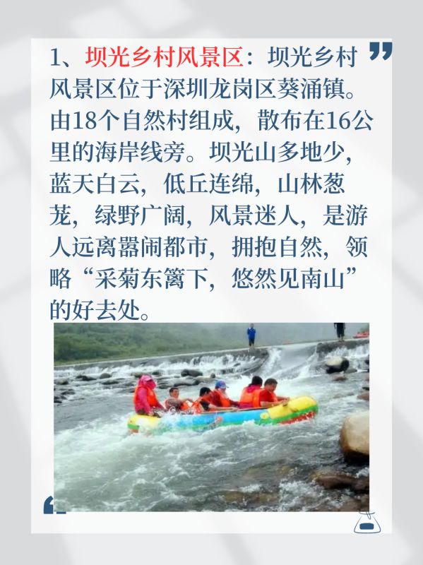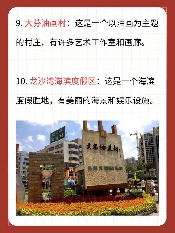 我认为:龙岗区是深圳市的一个区域,周边有许多有趣的旅游景区,它们各具特色,值得一游。