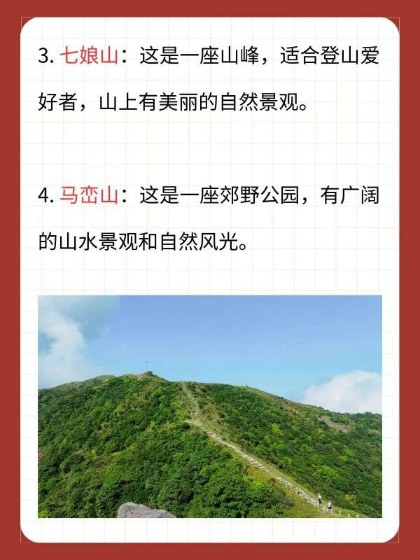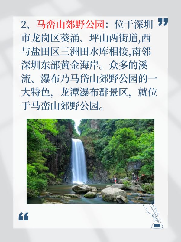 2、马峦山郊野公园:众多的溪流、瀑布乃马岱山郊野公园的一大特色,龙潭瀑布群景区,就位于马峦山郊野公园。