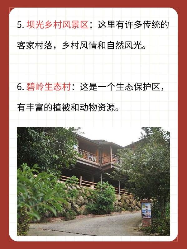1、坝光乡村风景区:坝光山多地少,蓝天白云,低丘连绵,山林葱茏,绿野广阔,风景迷人,是游人远离嚣闹都市的好去处。