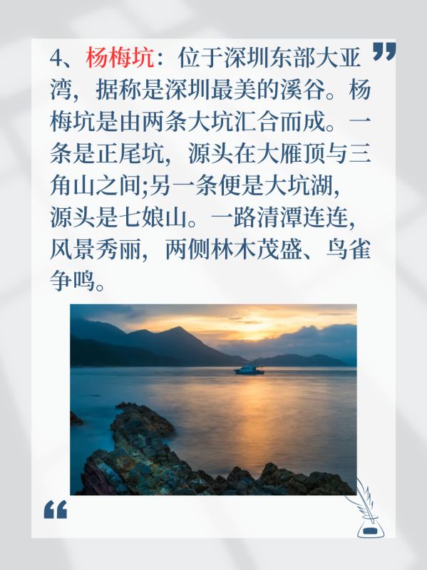 4、杨梅坑:位于深圳东部大亚湾,据称是深圳最美的溪谷。一路清潭连连,风景秀丽,两侧林木茂盛、鸟雀争鸣。