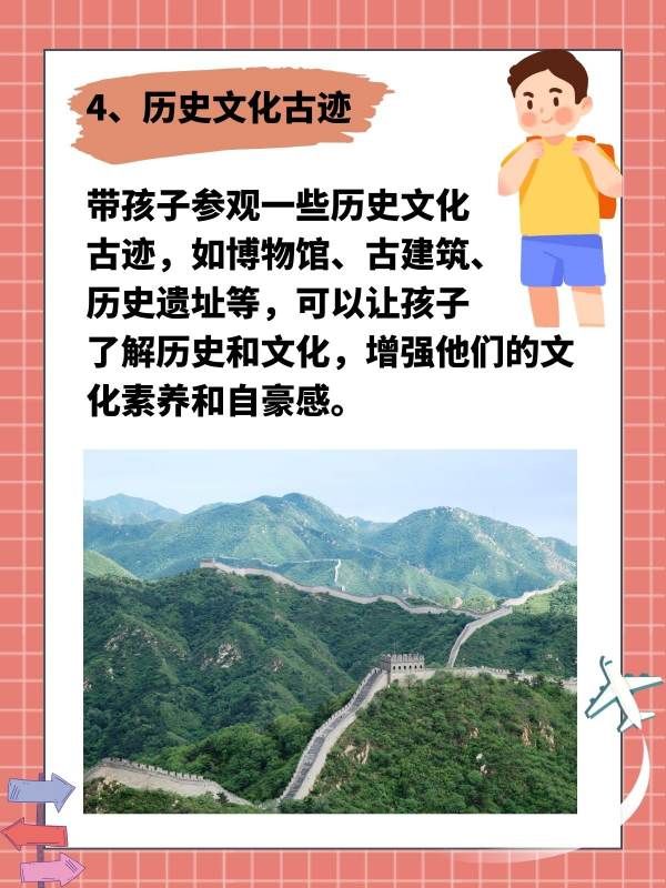带孩子参观一些历史文化古迹,如博物馆、古建筑、历史遗址等,可以让孩子了解历史和文化,增强他们的文化素养和自豪感。