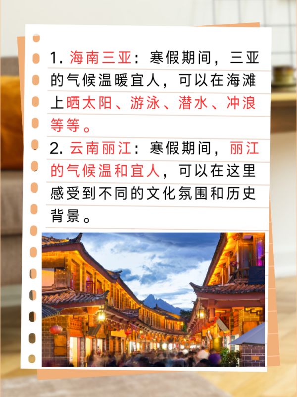 2. 云南丽江:丽江是一个充满异国情调的古城,也是一个拥有美丽自然风光的旅游胜地。在寒假期间,丽江的气候温和宜人,你可以在这里感受到不同的文化氛围和历史背景。