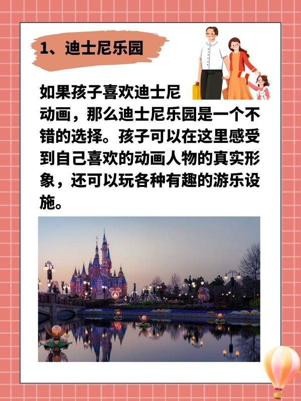 如果孩子喜欢迪士尼动画,那么迪士尼乐园是一个不错的选择。孩子可以在这里感受到自己喜欢的动画人物的真实形象,还可以玩各种有趣的游乐设施。