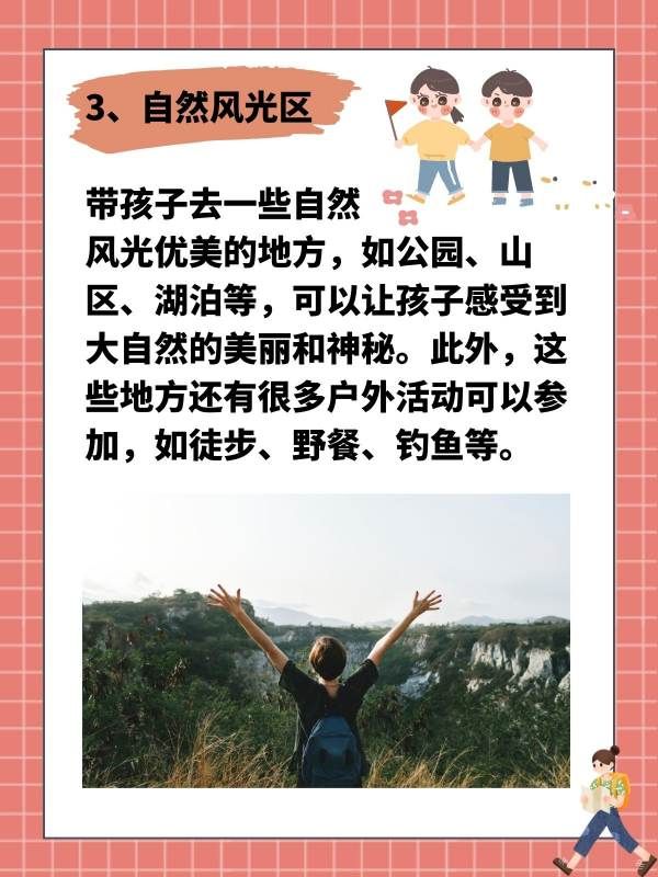 带孩子去一些自然风光优美的地方,如公园、山区、湖泊等,可以让孩子感受到大自然的美丽和神秘。此外,这些地方还有很多户外活动可以参加,如徒步、野餐、钓鱼等。