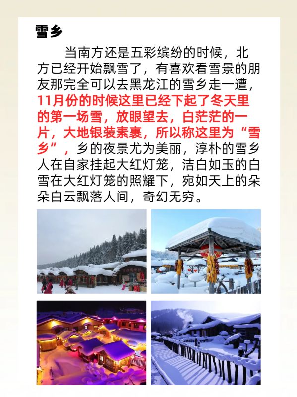 当南方还是五彩缤纷的时候,北方已经开始飘雪了,有喜欢看雪景的朋友那完全可以去黑龙江的雪乡走一遭,11月份的时候这里已经下起了冬天里的第一场雪,放眼望去,白茫茫的一片,大地银装素裹,所以称这里为“雪乡”,乡的夜景尤为美丽,淳朴的雪乡人在自家挂起大红灯笼,洁白如玉的白雪在大红灯笼的照耀下,宛如天上的朵朵白云飘落人间,奇幻无穷。
