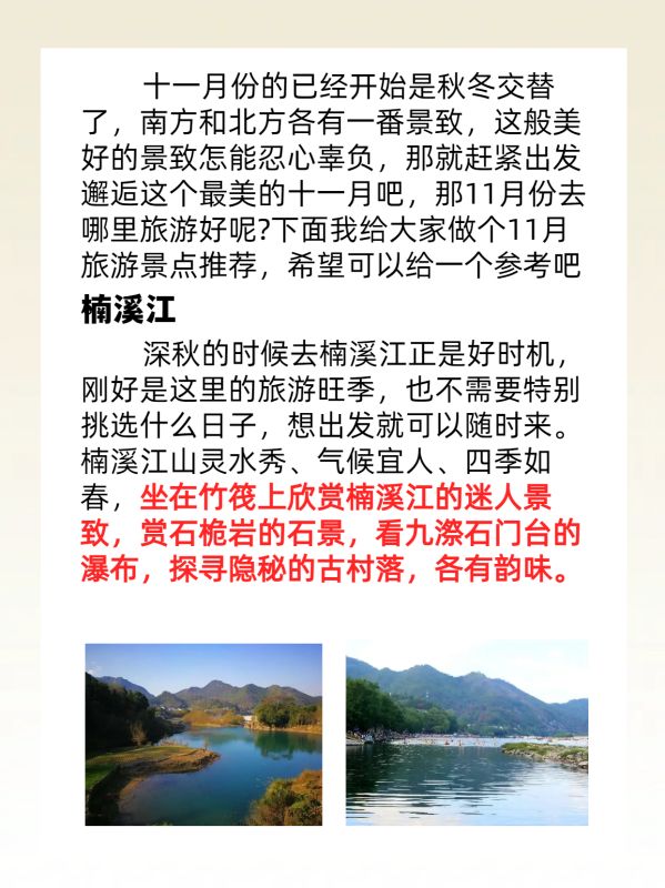 十一月份的已经开始是秋冬交替了,南方和北方各有一番景致,这般美好的景致怎能忍心辜负,那就赶紧出发邂逅这个最美的十一月吧,那11月份去哪里旅游好呢?下面我给大家做个11月旅游景点推荐,希望可以给一个参考吧。