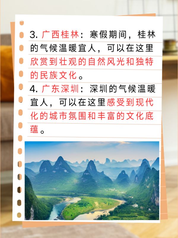 3. 广西桂林:桂林是一个山水甲天下的城市,也是一个拥有丰富自然资源的旅游胜地。在寒假期间,桂林的气候温暖宜人,你可以在这里欣赏到壮观的自然风光和独特的民族文化。