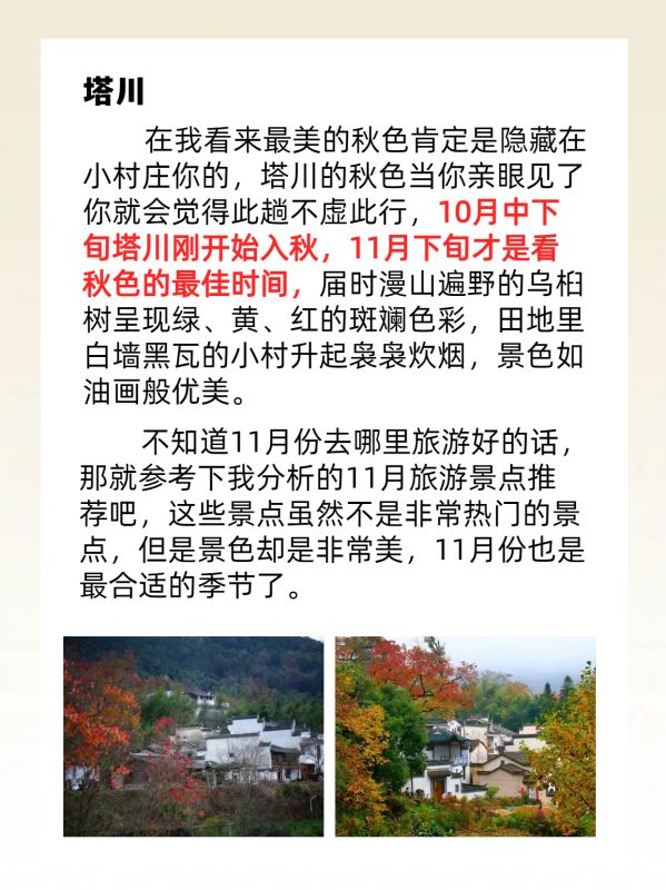 在我看来最美的秋色肯定是隐藏在小村庄你的,塔川的秋色当你亲眼见了你就会觉得此趟不虚此行,10月中下旬塔川刚开始入秋,11月下旬才是看秋色的最佳时间,届时漫山遍野的乌桕树呈现绿、黄、红的斑斓色彩,田地里白墙黑瓦的小村升起袅袅炊烟,景色如油画般优美。