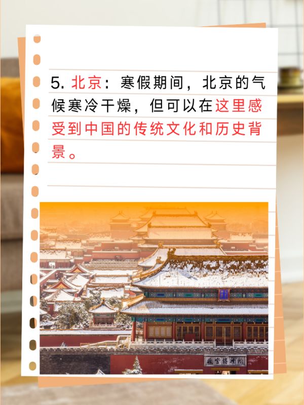 5. 北京:北京是一个历史悠久的城市,也是一个拥有丰富文化遗产的旅游胜地。在寒假期间,北京的气候寒冷干燥,但你可以在这里感受到中国的传统文化和历史背景。