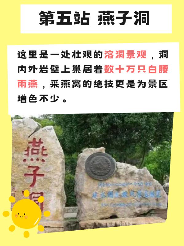 被称为“亚洲第一溶洞”,燕子洞名字来源洞内有很多燕子在这里栖息,洞外是众多桃树以及李树。每当春季的时候,这里开满了桃花和梨花,为岩洞增色不少。燕子洞冬暖夏凉,夏季进洞凉爽舒适,冬季进洞则暖气充溢。