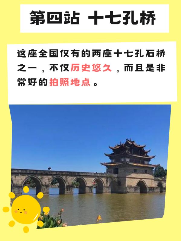 其实呢坐小火车去团山的路这里也是作为停靠站点的,但是建议单独前往参观,距离建水古城不远。这样有十七孔的石桥在全国只有两座,这里不仅历史悠久拍照也是非常出片。