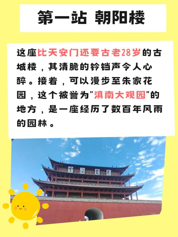 这是一座比天安门还大28岁的古城楼,楼上清脆悦耳的铃铛声让人陶醉其中。从朝阳楼穿过可以一路逛到朱家花园去,朱家花园被称为“滇南大观园”,是一处历经了数百年风雨的园林景观,占地面积也是非常大,古时朱家的豪宅。到朝阳楼到