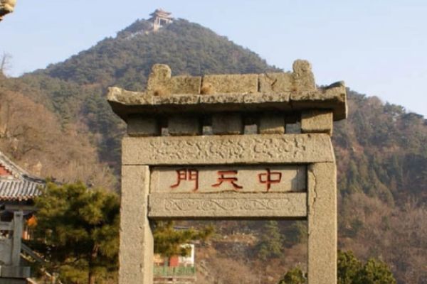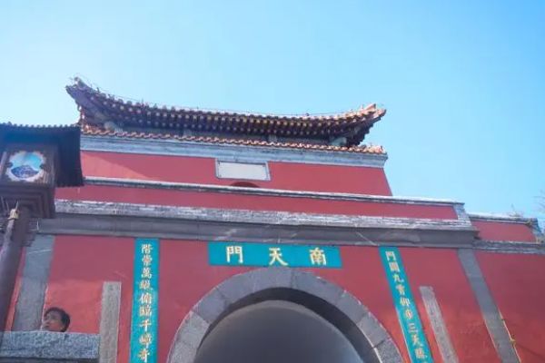 由下仰视,犹如天上宫阙,是登泰山顶的门户。门为阁楼式建筑,石砌拱形门洞,额题南天门。红墙点缀,黄色琉璃瓦盖顶,气势雄伟。门侧有楹联曰门辟九霄仰步三天胜迹;阶崇万级俯临千嶂奇观。