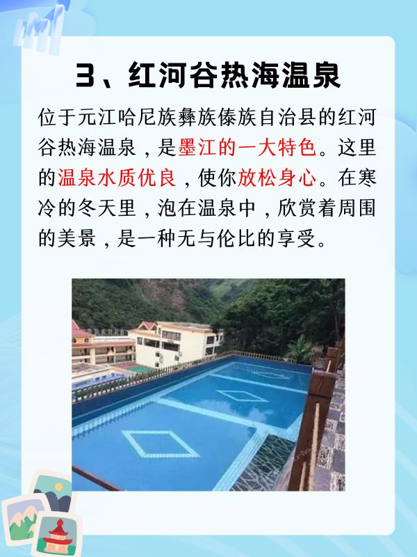 3、红河谷热海温泉位于元江哈尼族彝族傣族自治县的红河谷热海温泉,是墨江的一大特色。这里的温泉水质优良,有着治疗和放松身心的作用。
