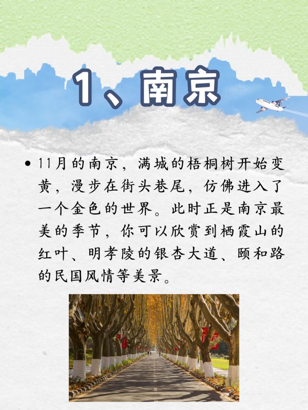 11月的南京,满城的梧桐树开始变黄,漫步在街头巷尾,仿佛进入了一个金色的世界。此时正是南京最美的季节,你可以欣赏到栖霞山的红叶、明孝陵的银杏大道、颐和路的民国风情等美景。