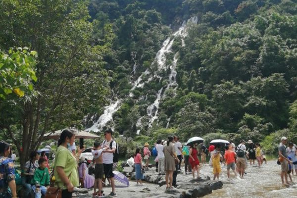 3、第三站:翠谷瀑布翠谷瀑布群山苍翠欲滴,田野郁郁葱葱,翠谷因此而得名,这里密集的峰丛耸入云天,山峰上原始森林密布,山腰云雾缭绕,清心悦目,这也是电视剧《将夜》《双世宠妃》 等影视剧和综艺《跟着贝尔去冒险》首选拍摄地,也算是景区一个网红拍摄点。如若来时,正值夏季,瀑布脚下的亲水绝对是小朋友最最最喜爱的地方,在这可以和小朋友打打水仗。