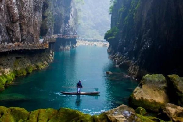 大七孔景点由一座大七孔古桥而得名,充满了神秘、奇特的色彩,以原始森林、峡谷、伏流、地下湖为主景观。峻险神奇、气势雄峻磅礴,山高谷深,游人在大七孔桥旁的梦塘上乘船,溯流而上便进入“天神峡谷”。