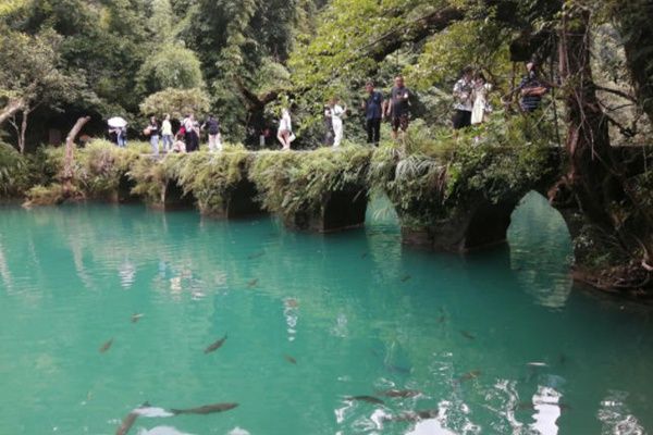 这是一座小巧玲珑的七孔古桥,建于清道光年间,在涵碧潭上的小七孔古桥,处处透着宁静的信息,从远处看,特别恬静。这也是整个景区的精华所在,景区也是因为这座桥而得名。