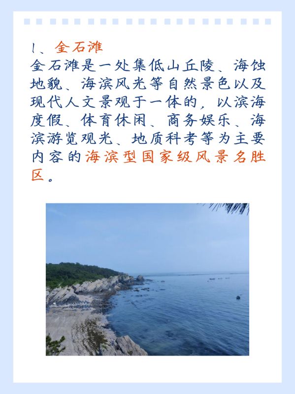 金石滩是一处集低山丘陵、海蚀地貌、海滨风光等自然景色以及现代人文景观于一体的,以滨海度假、体育休闲、商务娱乐、海滨游览观光、地质科考等为主要内容的海滨型国家级风景名胜区。金石滩景区陆地面积70.34平方公里,海域面积58平方公里,海岸线30多公里,冬暖夏凉,凝聚了3-9亿年地质奇观,形态各异,巧夺天工,被称为“凝固的动物世界”、“天然地质博物馆”。