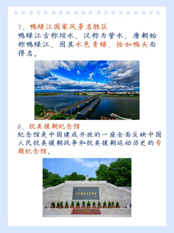 丹东边境旅游区位于丹东市,这里有着最长的边境城市和最美的江海风光,还有着深厚的抗美援朝和边防文化,这些都为这里带来了许多独具特色的景点。游客可以登上边境观光塔欣赏边境风光,探寻边境历史文化之美。