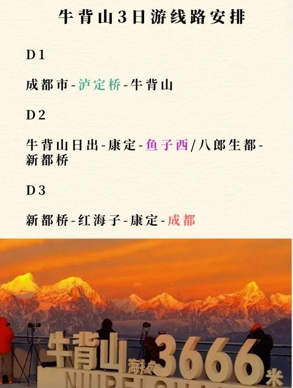 4. 行程安排:第一天可以从成都出发,到达荥经县后入住酒店。第二天一早前往牛背山景区,游览完毕后返回酒店休息。第三天返回成都。