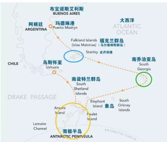 在南极半岛的基础上还游览了更低纬度的福克兰群岛和南乔治亚岛。福克兰群岛、南乔治亚岛的最佳旅行季节和南极半岛有很大不同:为每年的11月中之前,和1月底之后。