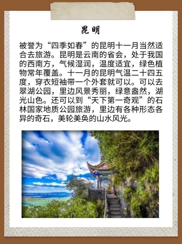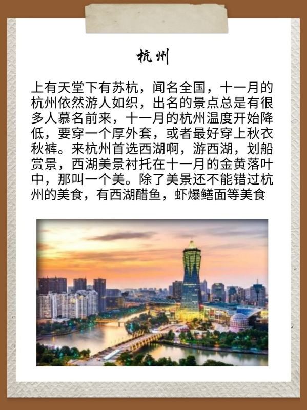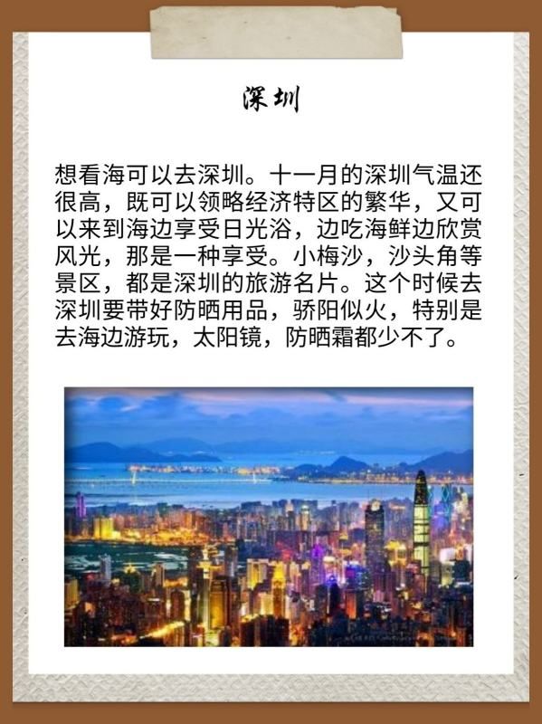 一、昆明;二、南京;三、深圳;四、厦门;五、杭州等。十一月的昆明气温二十四五度,穿衣短袖带一个外套就可以;南京可以逛夫子庙,品尝美食小吃;去深圳要带好防晒用品,特别是去海边游玩;厦门十一月气温正好合适,没有夏日的骄阳,没有冬日的冷风;十一月的杭州西湖美轮美奂。