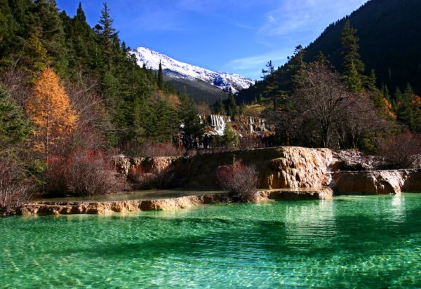 九寨沟被人誉为“童话世界”,号称“水景之王”,翠湖、香瀑、彩林、雪峰、藏情、蓝冰山水六绝构成了中国一大奇观。九寨沟四周雪峰高耸,飞瀑多姿多彩,急流汹涌澎湃,林木青葱婆娑,泉、瀑、河、滩108个海子,构成一个个五彩斑澜的瑶池玉盆,冽透底,变幻无穷。