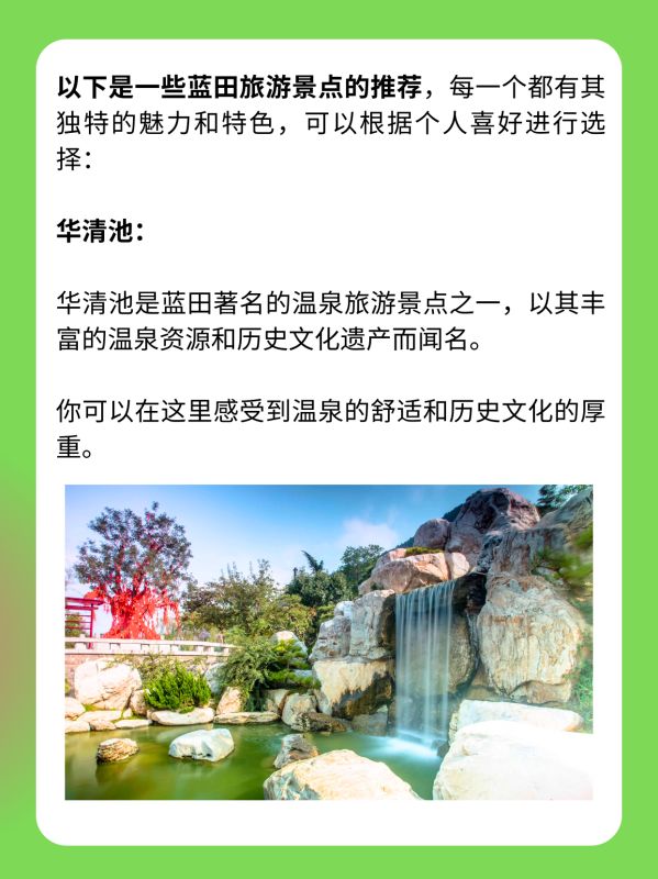 华清池:华清池是蓝田著名的温泉旅游景点之一,以其丰富的温泉资源和历史文化遗产而闻名。你可以在这里感受到温泉的舒适和历史文化的厚重。