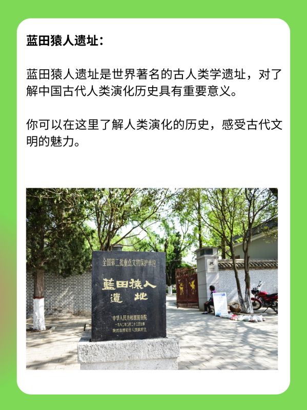 蓝田猿人遗址:蓝田猿人遗址是世界著名的古人类学遗址,对了解中国古代人类演化历史具有重要意义。你可以在这里了解人类演化的历史,感受古代文明的魅力。