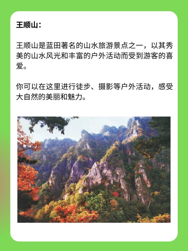 王顺山:王顺山是蓝田著名的山水旅游景点之一,以其秀美的山水风光和丰富的户外活动而受到游客的喜爱。你可以在这里进行徒步、摄影等户外活动,感受大自然的美丽和魅力。