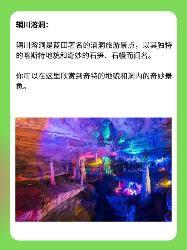 辋川溶洞:辋川溶洞是蓝田著名的溶洞旅游景点,以其独特的喀斯特地貌和奇妙的石笋、石幔而闻名。你可以在这里欣赏到奇特的地貌和洞内的奇妙景象。