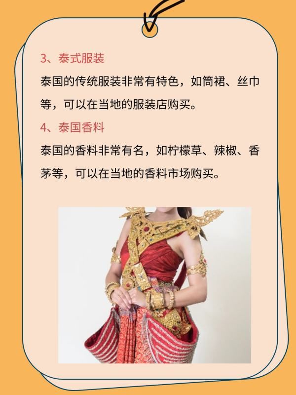 泰国的传统服装非常有特色,如筒裙、丝巾等,可以在当地的服装店购买。