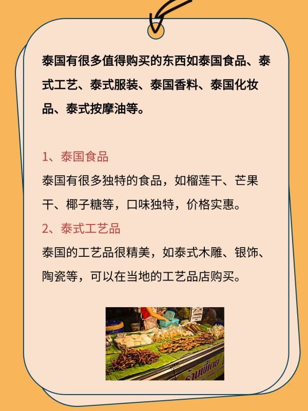 泰国有很多值得购买的东西如泰国食品、泰式工艺、泰式服装、泰国香料、泰国化妆品、泰式按摩油等。