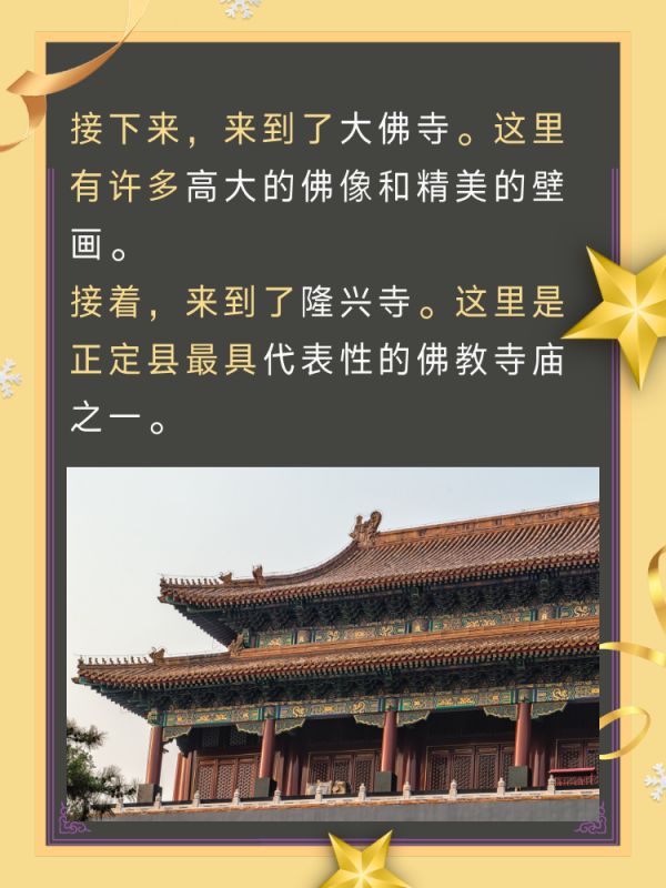 接着,我们来到了隆兴寺。这里是正定县最具代表性的佛教寺庙之一,有着悠久的历史和丰富的文化内涵。寺内有许多的佛像、壁画和文物,让人领略到了佛教艺术的魅力。
