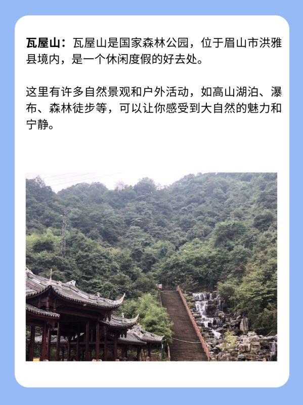 瓦屋山:瓦屋山是国家森林公园,位于眉山市洪雅县境内,是一个休闲度假的好去处。