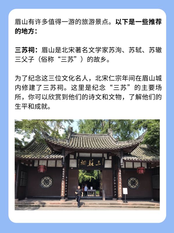 三苏祠:眉山是北宋著名文学家苏洵、苏轼、苏辙三父子(俗称“三苏”)的故乡。