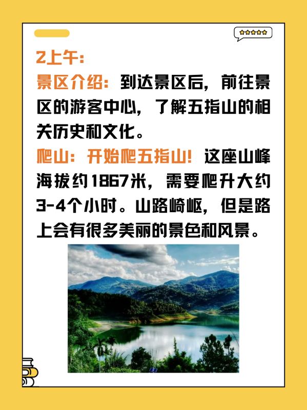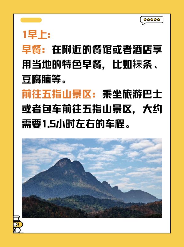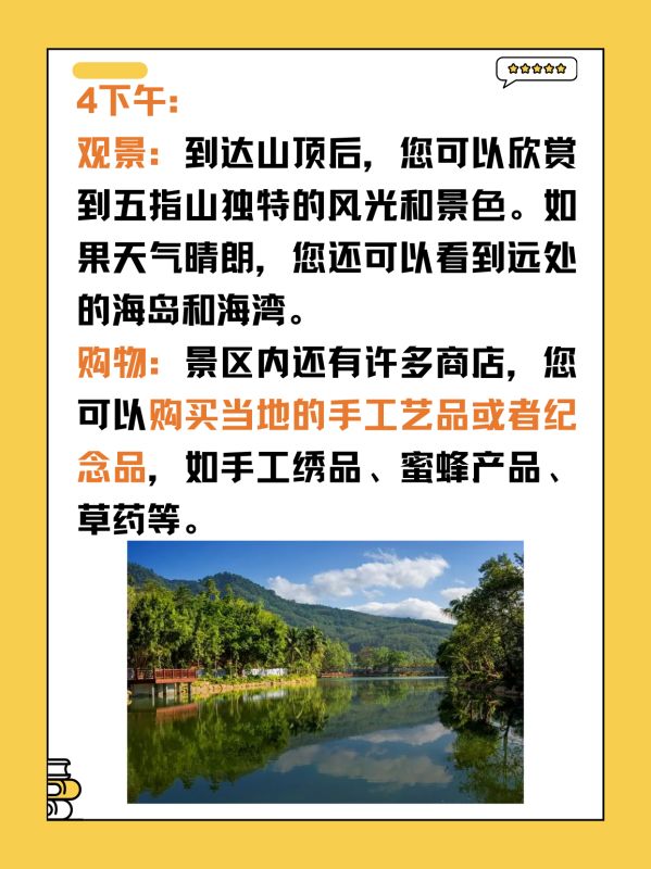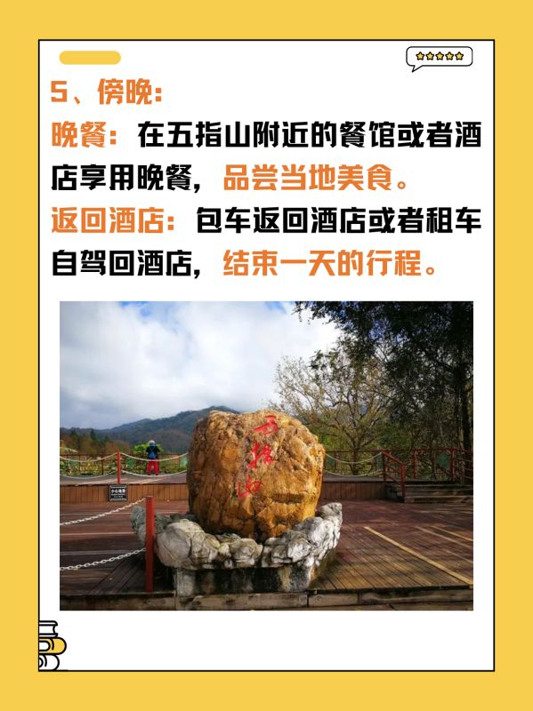 前往五指山景区:乘坐旅游巴士或者包车前往五指山景区。