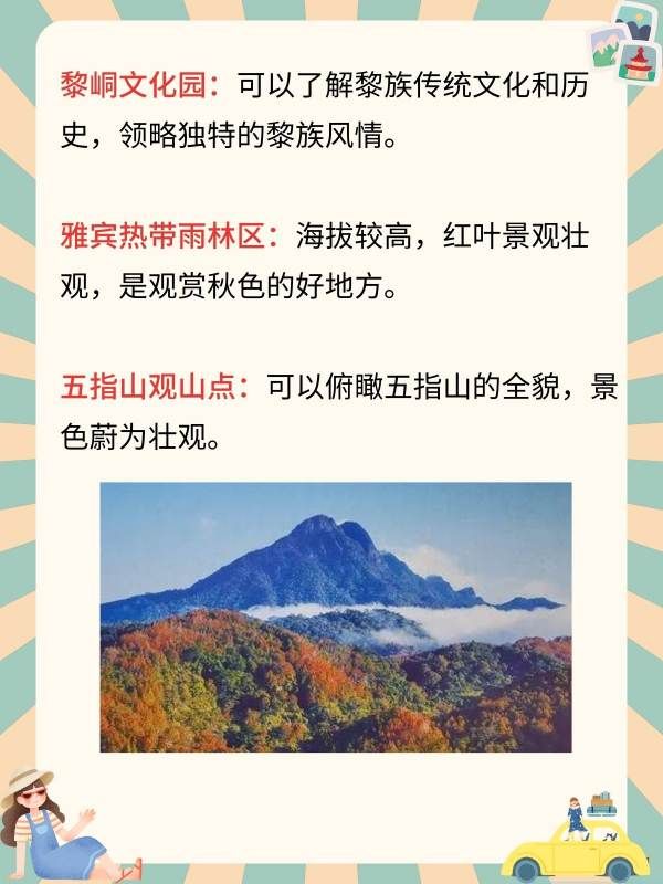 到海南五指山旅游,可以游览以下景点:一、5处自然风光。黎母山;五指山热带雨林风景区;太平山瀑布;阿陀岭;木色湖。二、5处人文景观。黎峒文化园;五指山革命根据地;中华民族文化村;琼崖公学纪念亭;仿古黎村。